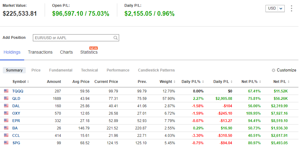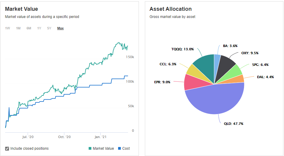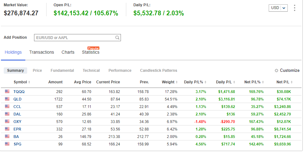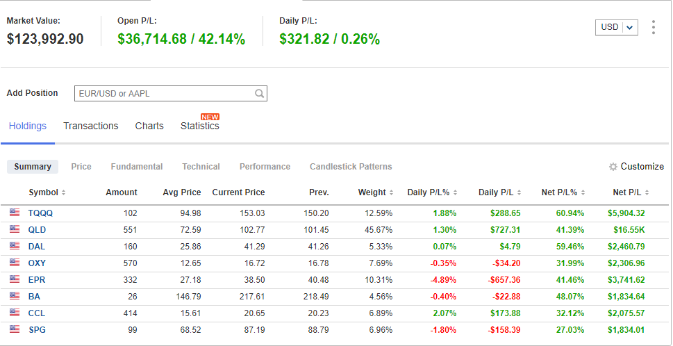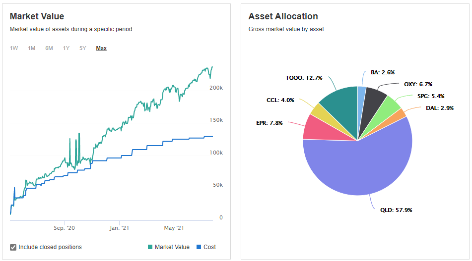 원래 대강 QLD:TQQQ:개별주=55:15:30 비율로 가져가려고 했으나, 최근 개별주 가격이 미친속돌 올라서 비율이 조금 흐트러 졌다. 월급 들어오는대로 QLD/TQQQ를 더 사모아야 겠다.